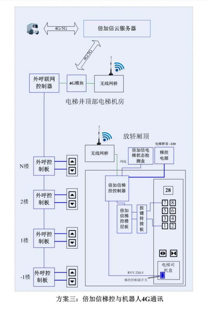 (1)機器人在電梯外,通過4G網絡等發送指令倍加信云服務器,倍加信云服務器再與倍加信梯控系統通訊,系統自動點亮上樓或下樓按鍵,實現呼梯功能。