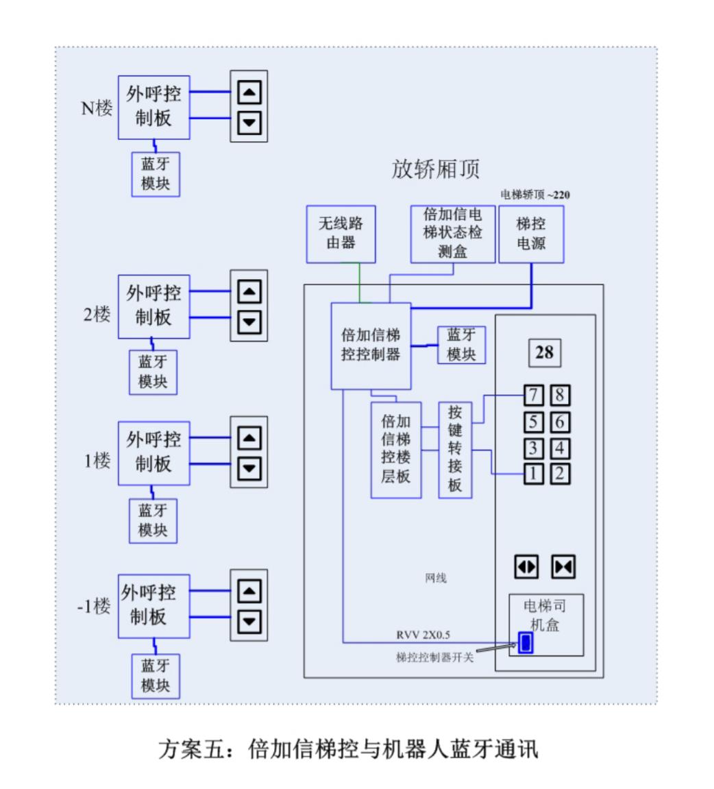 (1)機器人在電梯外,通個藍牙連接發送指令倍加信梯控系統,系統自動點亮上樓或下樓按鍵,實現呼梯功能。