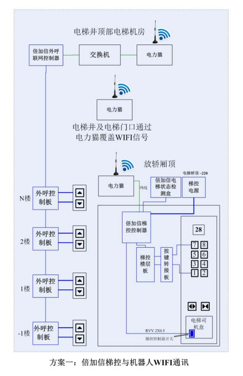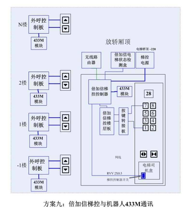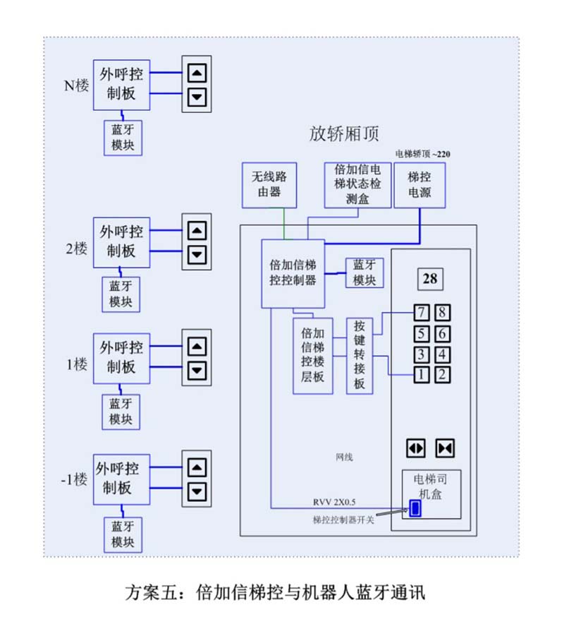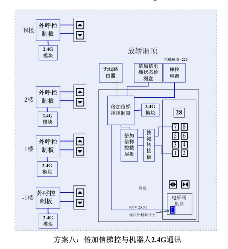 (1)機(jī)器人在電梯外,通個Wifi、藍(lán)牙、LoRa、Zigbee、2.4G、433M、語音或4G網(wǎng)絡(luò)等發(fā)送指令倍加信梯控系統(tǒng),系統(tǒng)自動點(diǎn)亮上樓或下樓按鍵,實(shí)現(xiàn)呼梯功能。
