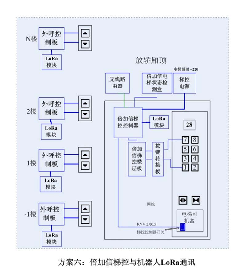 (1)機(jī)器人進(jìn)入電梯后,通個Wifi、藍(lán)牙、LoRa、Zigbee、2.4G、433M、語音或4G網(wǎng)絡(luò)等發(fā)送給倍加信梯控系統(tǒng),系統(tǒng)自動點(diǎn)亮對應(yīng)樓層按鍵,比如發(fā)去6樓指令,則6樓按鍵自動點(diǎn)亮,電梯送機(jī)器人員到6樓。