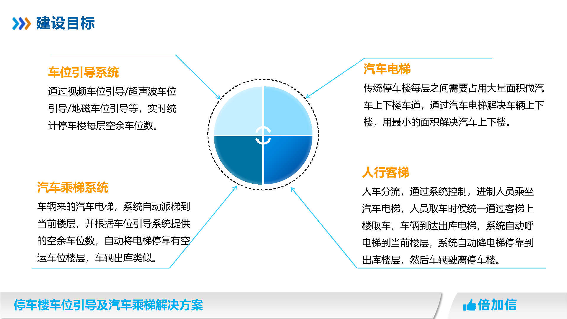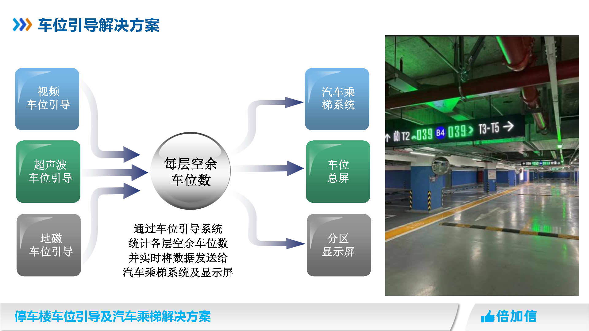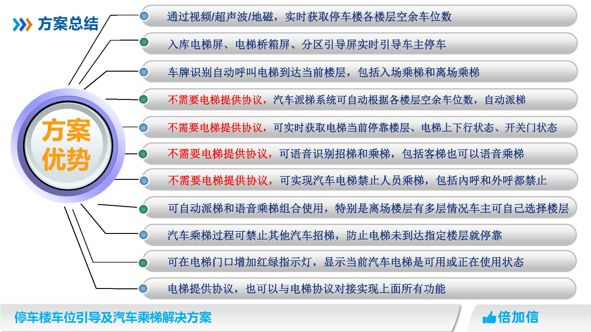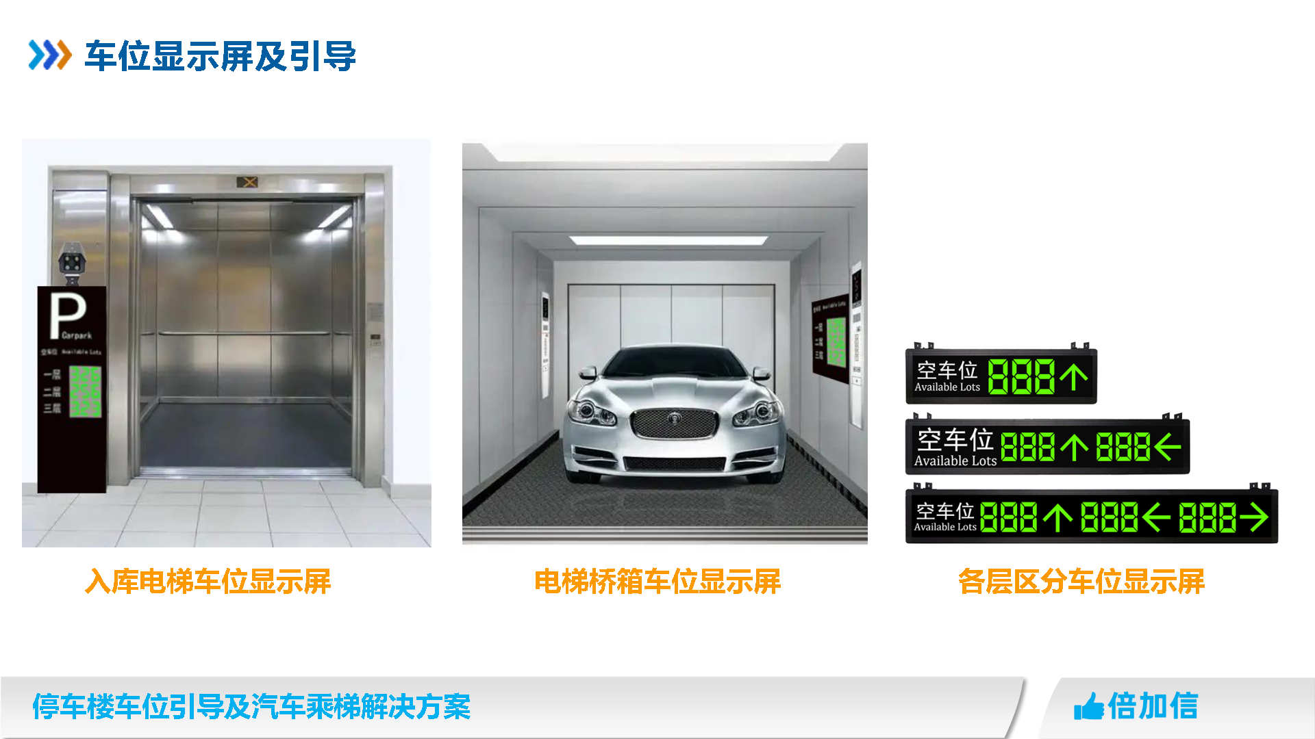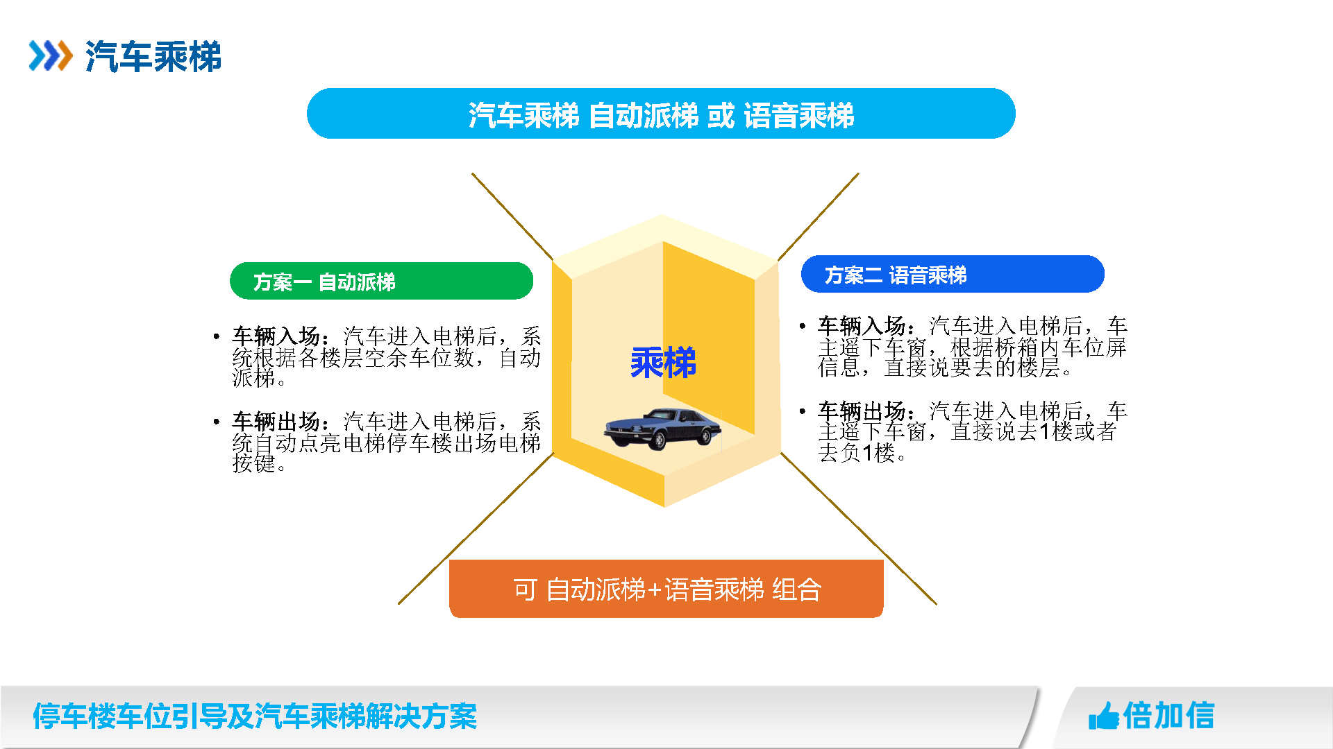 倍加信汽車乘梯系統方案優勢 1、通過視頻/超聲波/地磁,實時獲取停車樓各樓層空余車位數/ 2、入庫電梯屏、電梯橋箱屏、分區引導屏實時引導車主停車 3、車牌識別自動呼叫電梯到達當前樓層,包括入場乘梯和離場乘梯 4、不需要電梯提供協議,汽車派梯系統可自動根據各樓層空余車位數,自動派梯 5、不需要電梯提供協議,可實時獲取電梯當前停靠樓層、電梯上下行狀態、開關門狀態 6、不需要電梯提供協議,可語音識別招梯和乘梯,包括客梯也可以語音乘梯 7、不需要電梯提供協議,可實現汽車電梯禁止人員乘梯,包括內呼和外呼都禁止 8、可自動派梯和語音乘梯組合使用,特別是離場樓層有多層情況車主可自己選擇樓層 9、汽車乘梯過程可禁止其他汽車招梯,防止電梯未到達指定樓層就停靠 10、可在電梯門口增加紅綠指示燈,顯示當前汽車電梯是可用或正在使用狀態 11、電梯提供協議,也可以與電梯協議對接實現上面所有功能