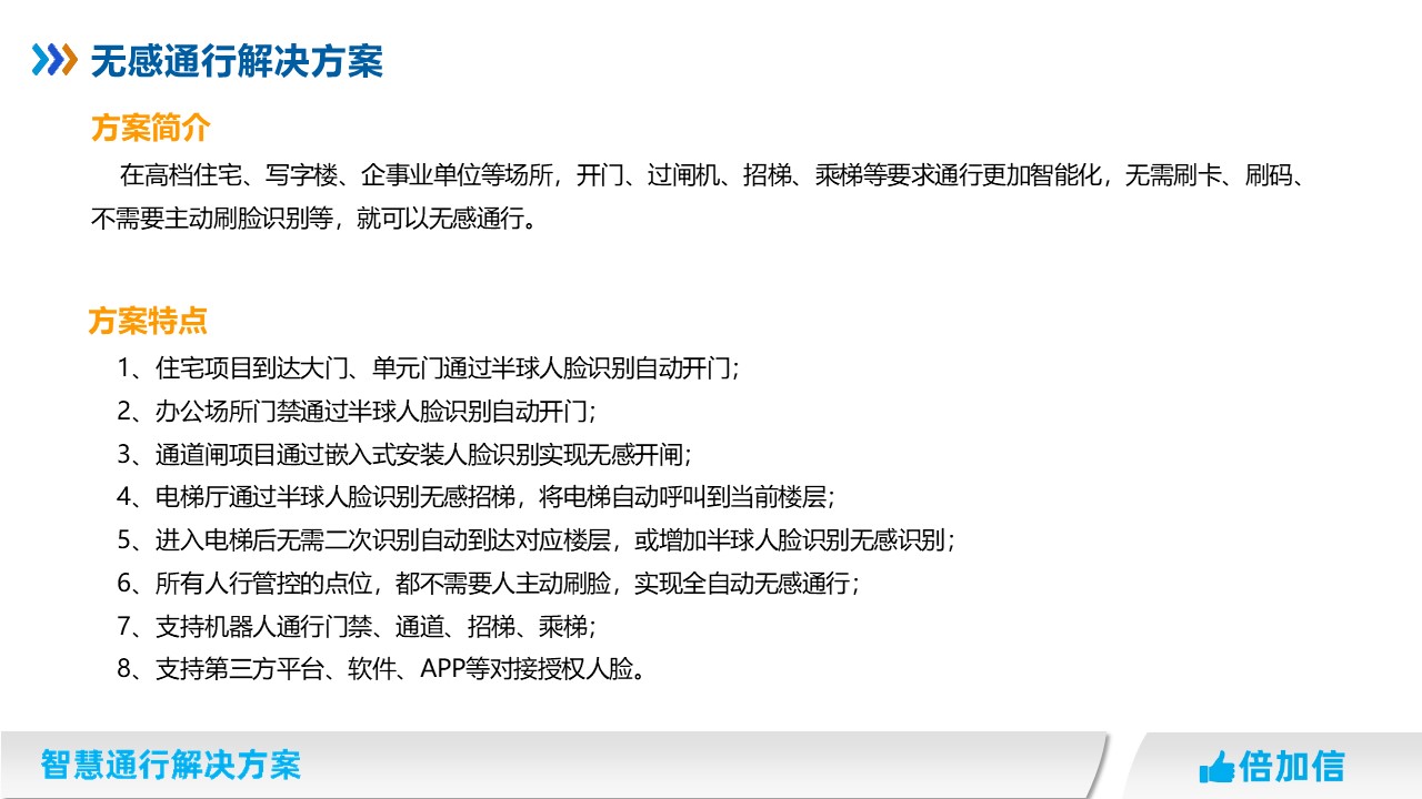 在高檔住宅、寫字樓、企事業(yè)單位等場(chǎng)所,開門、過閘機(jī)、招梯、乘梯等要求通行更加智能化,無需刷卡、刷碼、不需要主動(dòng)刷臉識(shí)別等,就可以無感通行。