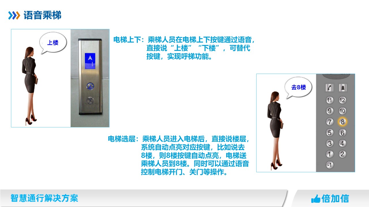 倍加信科技作為專業(yè)的梯控系統(tǒng)研發(fā)廠家,推出真正零接觸的乘梯方案。不判斷樓層權(quán)限,全程通過語音識別實現(xiàn)呼梯和乘梯。