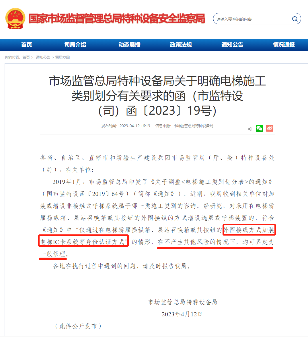 市場監管總局特種設備局關于明確電梯施工類別劃分有關要求的函(市監特設(司)函〔2023〕19號)